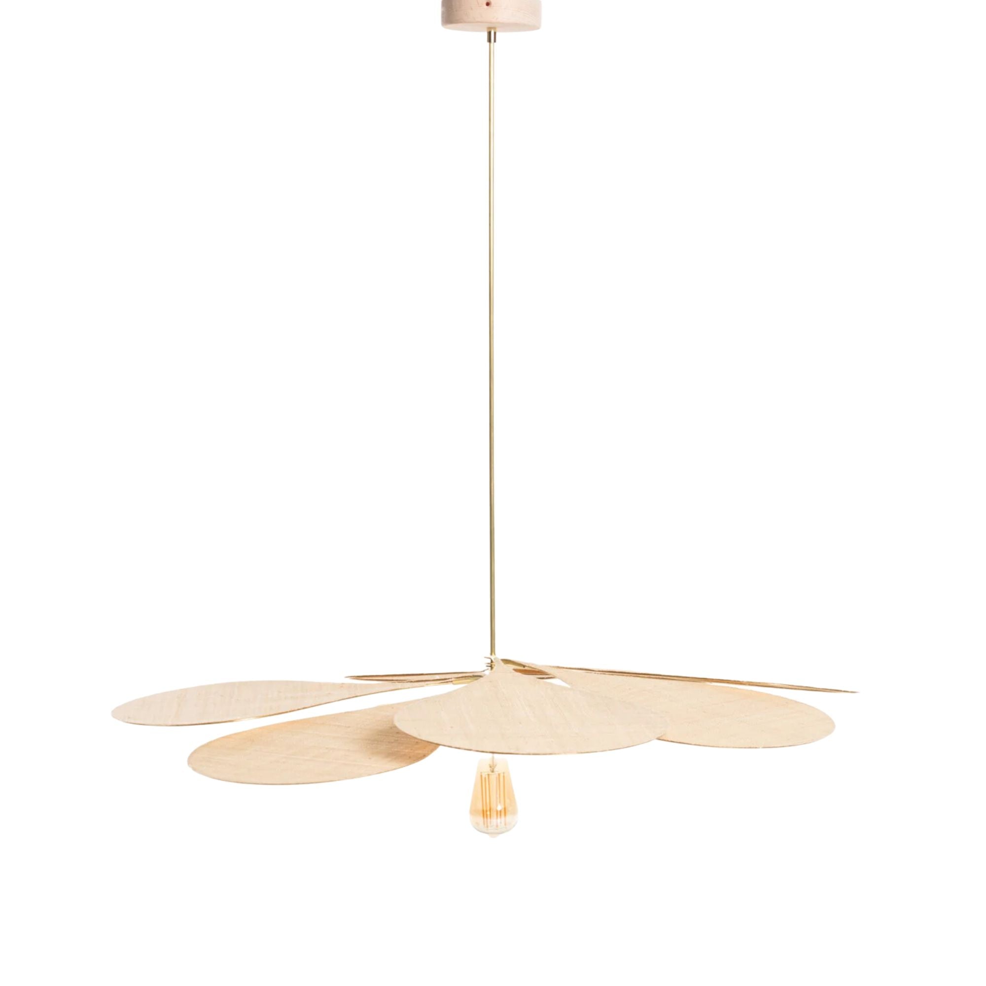 La suspension Pale précieuse est fabriquée au chateau de Méritein, la manufacture béarnaise de georges Store. Chaque pétale est entièrement fait à la main à partir d'un arceau de laiton sur lequel est tendue une toile à beurre de coton peinte à la main avec un mélange de pigments naturels. Tous les éléments de la suspension Pale précieuse sont sourcés en France.