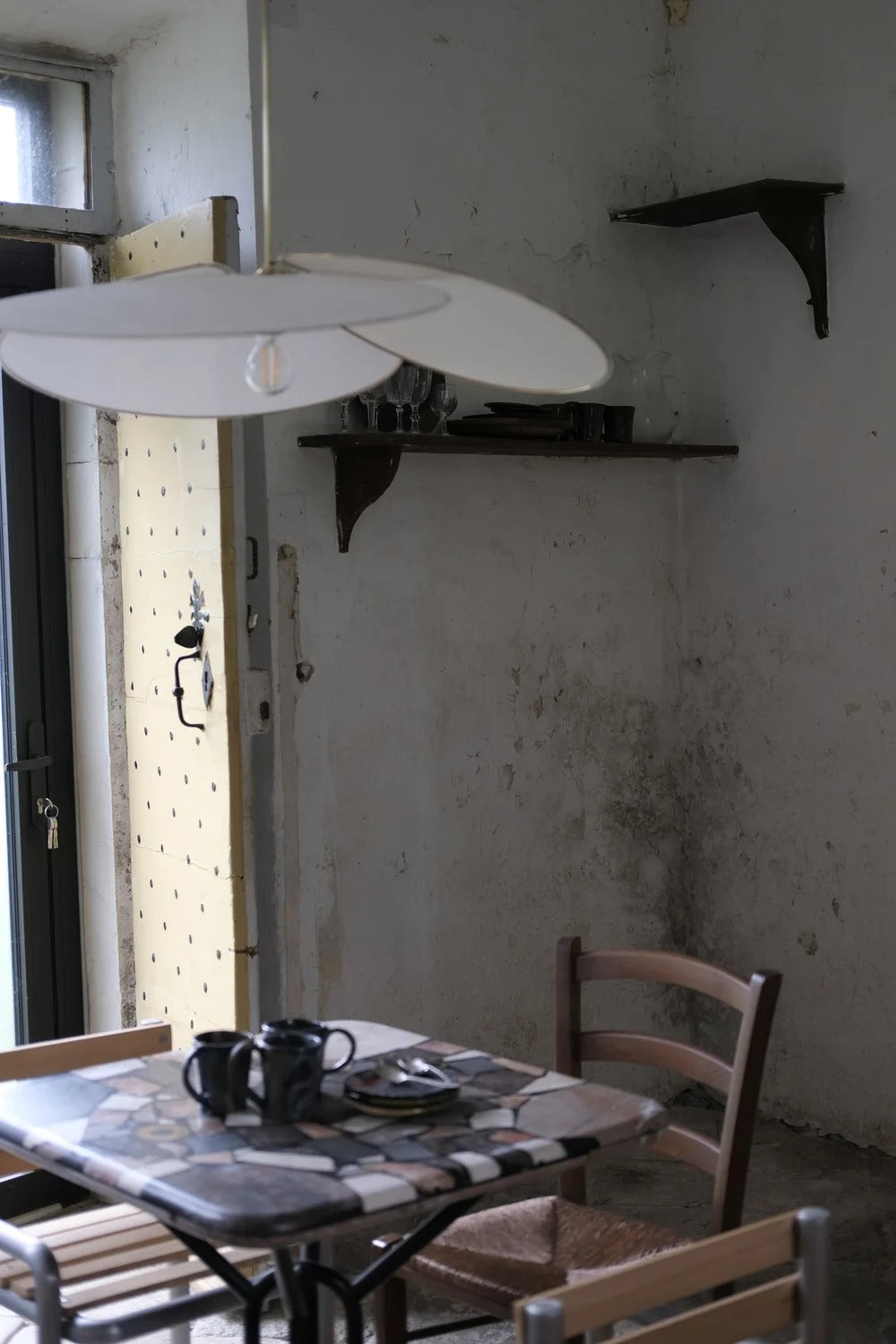 Handcrafted at the Château de Méritein, each piece is unique, with slight variations in color and imperfections. Pensée diffuses a soft light and delicate plays of shadow, with stackable brass hoops for a refined design.