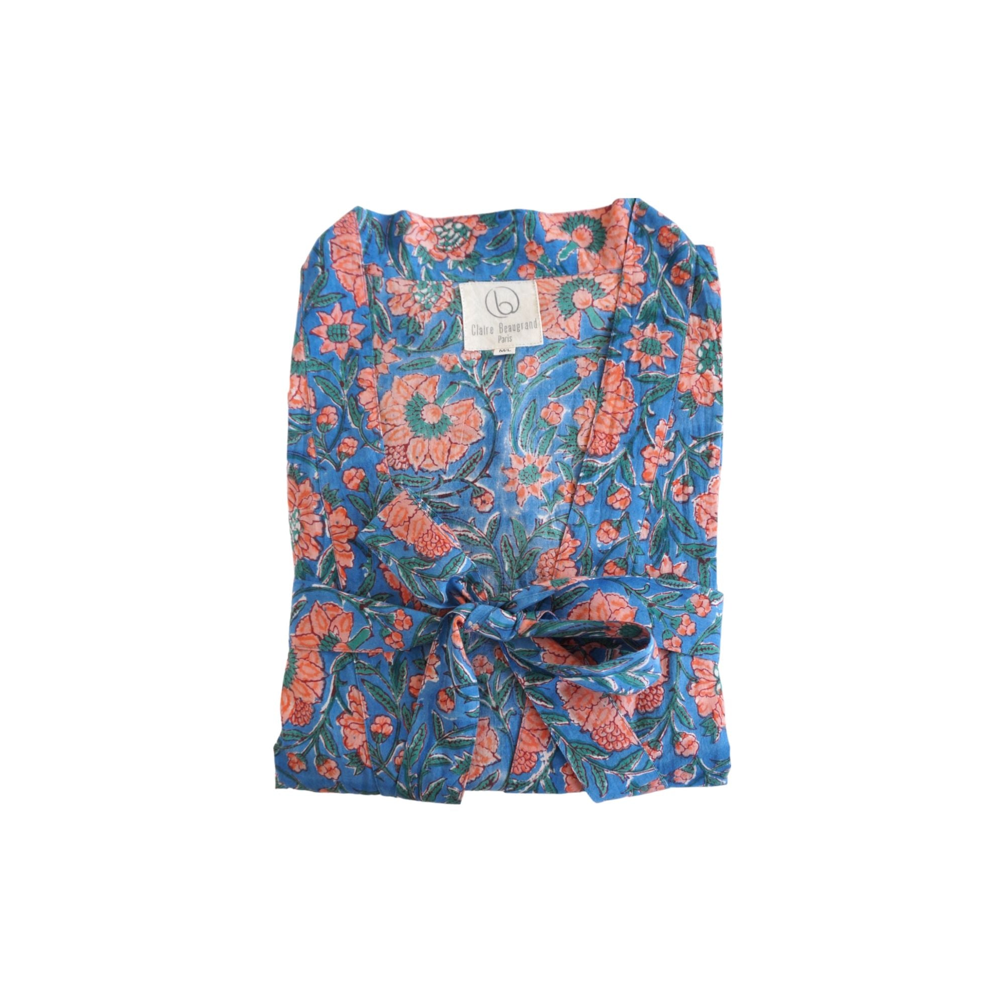 Ce joli kimono est confectionné en coton doux et orné d’un imprimé fleuri réalisé selon la technique artisanale du bloc de bois, un savoir-faire ancestral indien.